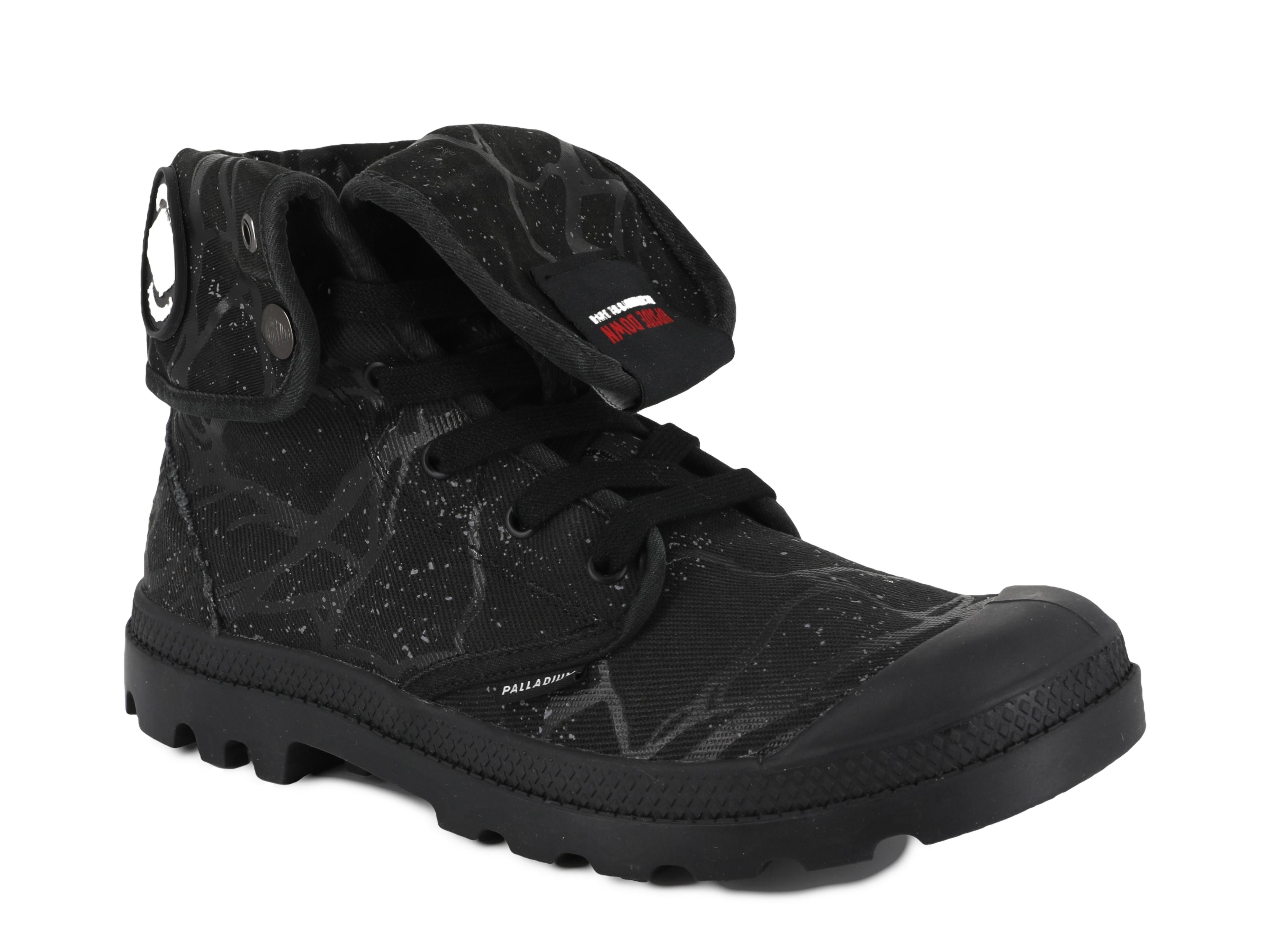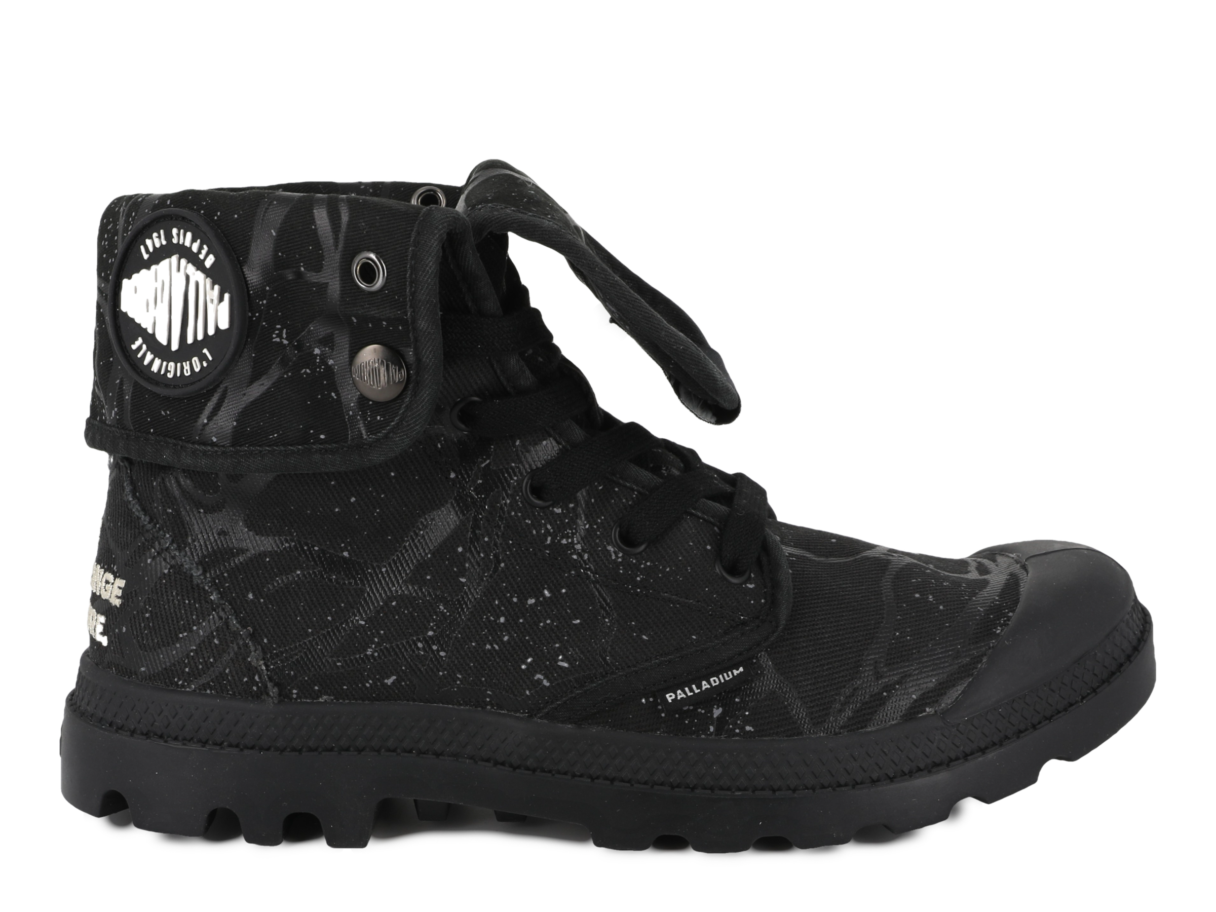 De BAGGY is geïnspireerd op Jim Hopper van Stranger Things Seizoen 5. Stone-washed zwart canvas met plaatjes van wijnranken en het "One Last Strange Adventure"-detail op de hiel geven zijn reis weer, terwijl hij met de robuuste buitenzool en noppen van Palladium klaar is voor elke wereld.