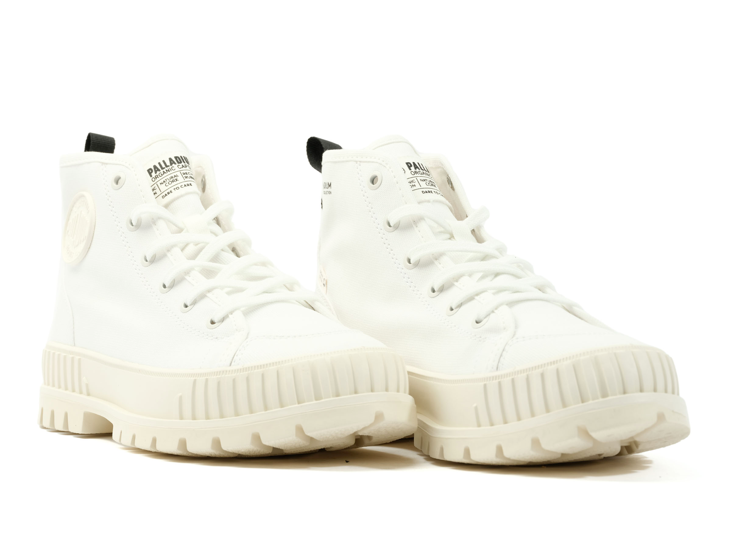 Geschiedenis en hedendaagse styling worden slim gecombineerd in deze versie van de Pallashock, een nieuwe versie van de jaren 90-sneaker uit de Palladium-archieven. Deze stevige maar toch lichte retro schoen met hoge tong - onderdeel van onze traditionele collectie - toont onze inzet voor groene waarden en de bescherming van de planeet, met een gerecyclede voering en rubberen buitenzool, en een bovenwerk van biologisch katoencanvas.